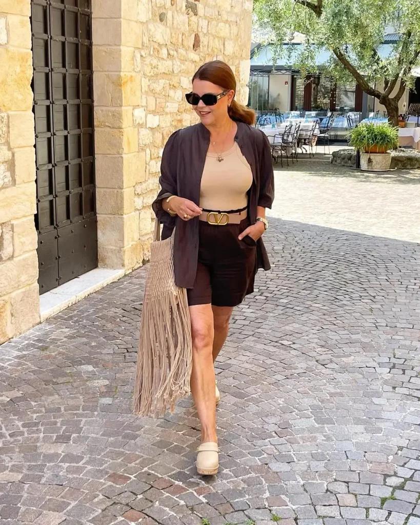 Visiting charming white villages requires clothing that allows you to move comfortably while exploring narrow streets and scenic viewpoints. Linen shorts paired with a tucked blouse create a breathable and stylish combination. Leather sandals and a compact crossbody bag add convenience without sacrificing style, making this look both practical and polished.