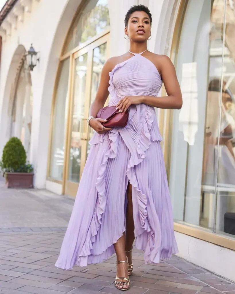 Lilac dresses with pleats and cascading ruffles create memorable, formal yet playful spring wedding guest looks. Halter necklines and subtle slits balance softness with structure.