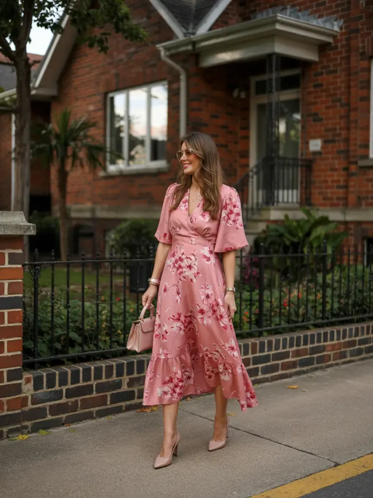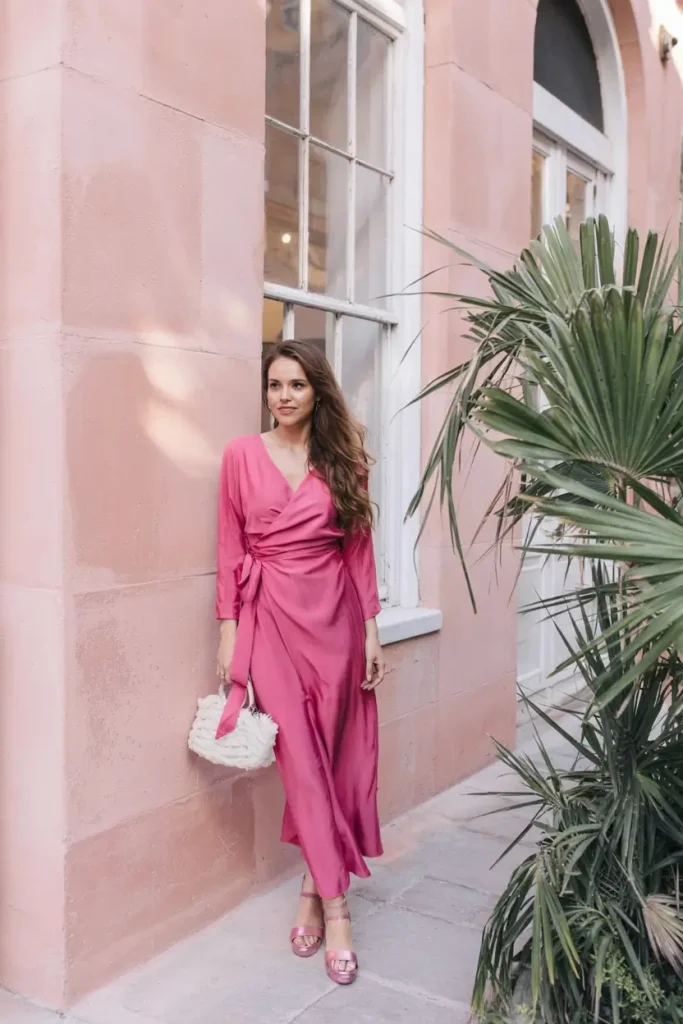 Warm pink satin wrap dresses offer flattering, feminine silhouettes. Tie-waist details define the shape, while soft shimmer enhances the elegance. These pieces are ideal for polished yet comfortable spring wedding guest styling.