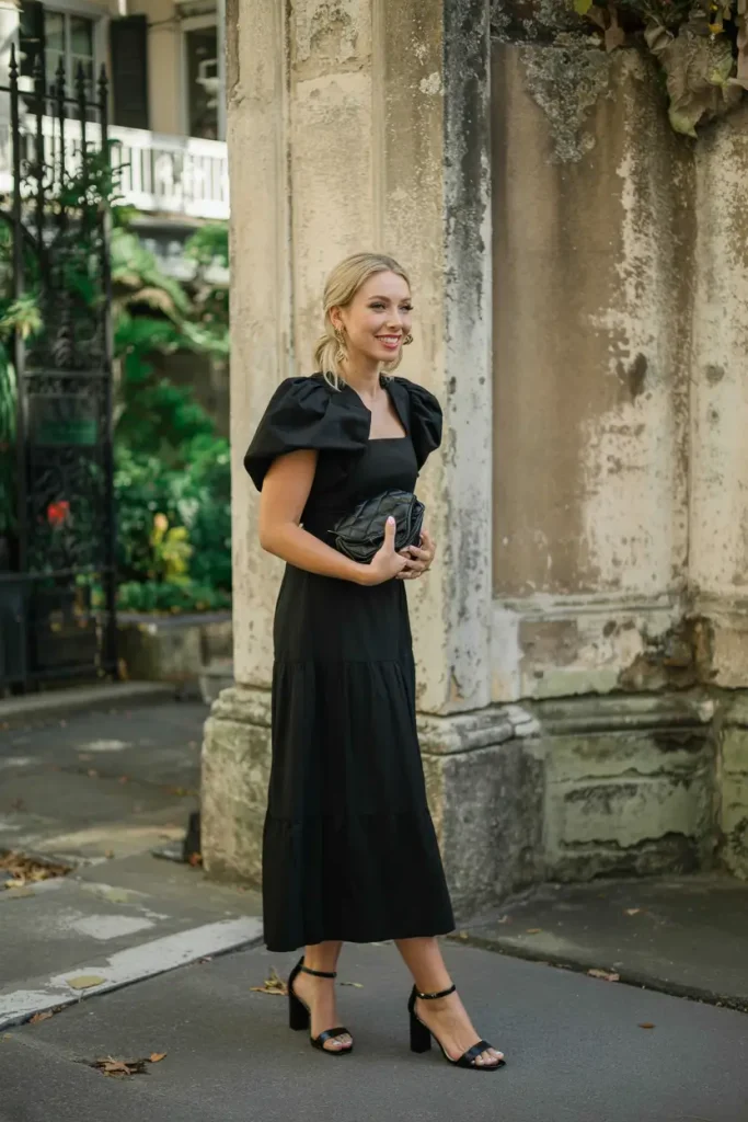 Black dresses for spring weddings can be airy and sculptural. Puff sleeves and square necklines create striking yet soft silhouettes suitable for classy spring wedding guest attire.