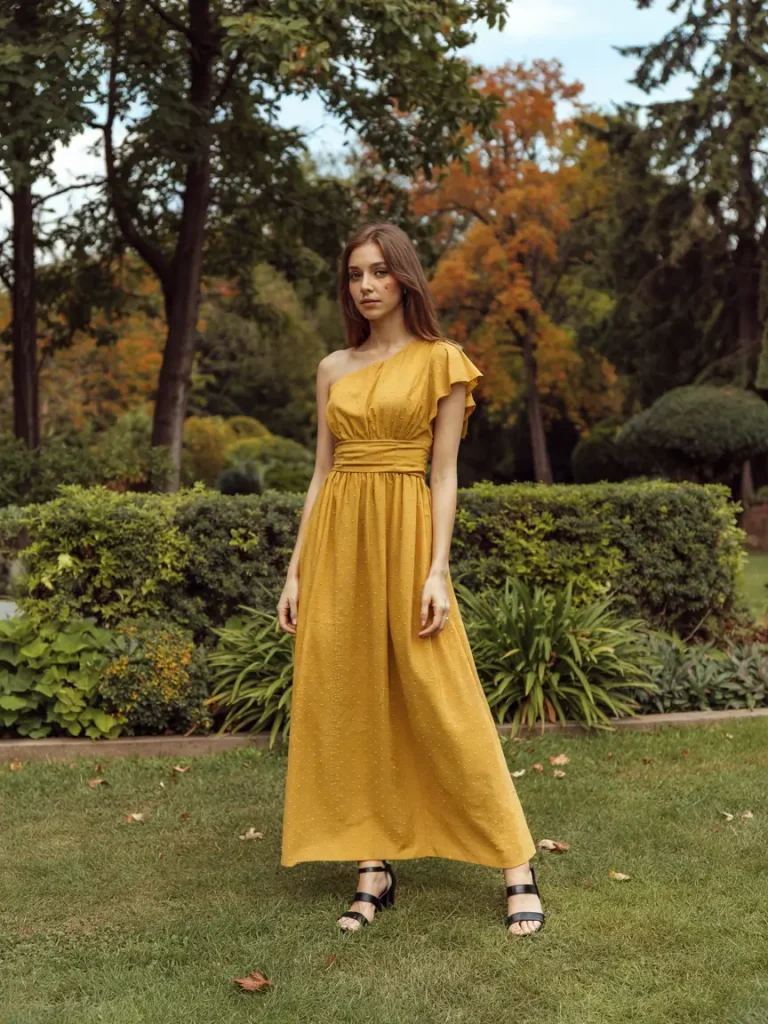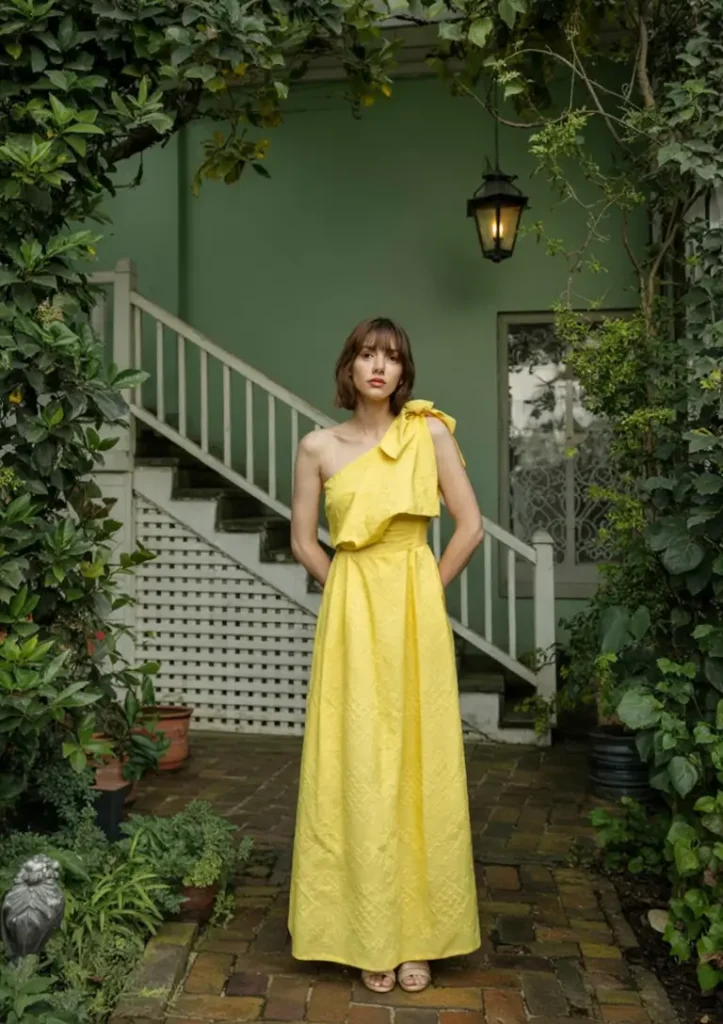 The fabric maintains its shape without heaviness, and subtle textures add visual interest. Minimal styling with simple sandals, natural hair, and soft makeup keeps the look effortlessly elegant. Yellow hues like butter and citron enhance photographs and complement various skin tones, offering a gentle but standout presence for a spring wedding guest.