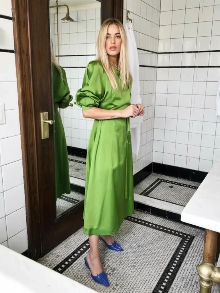 Bold green satin dresses create contemporary yet refined silhouettes. Structured sleeves and reflective fabrics add a subtle editorial touch suitable for standout spring wedding guest looks.