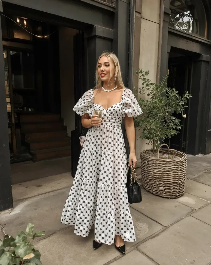 Polka dot dresses with tiered skirts and puff sleeves combine playful charm with romance. Sweetheart necklines add vintage flair while modern accessories keep the outfit current, ideal for casual to semi-formal spring wedding guest styling.
