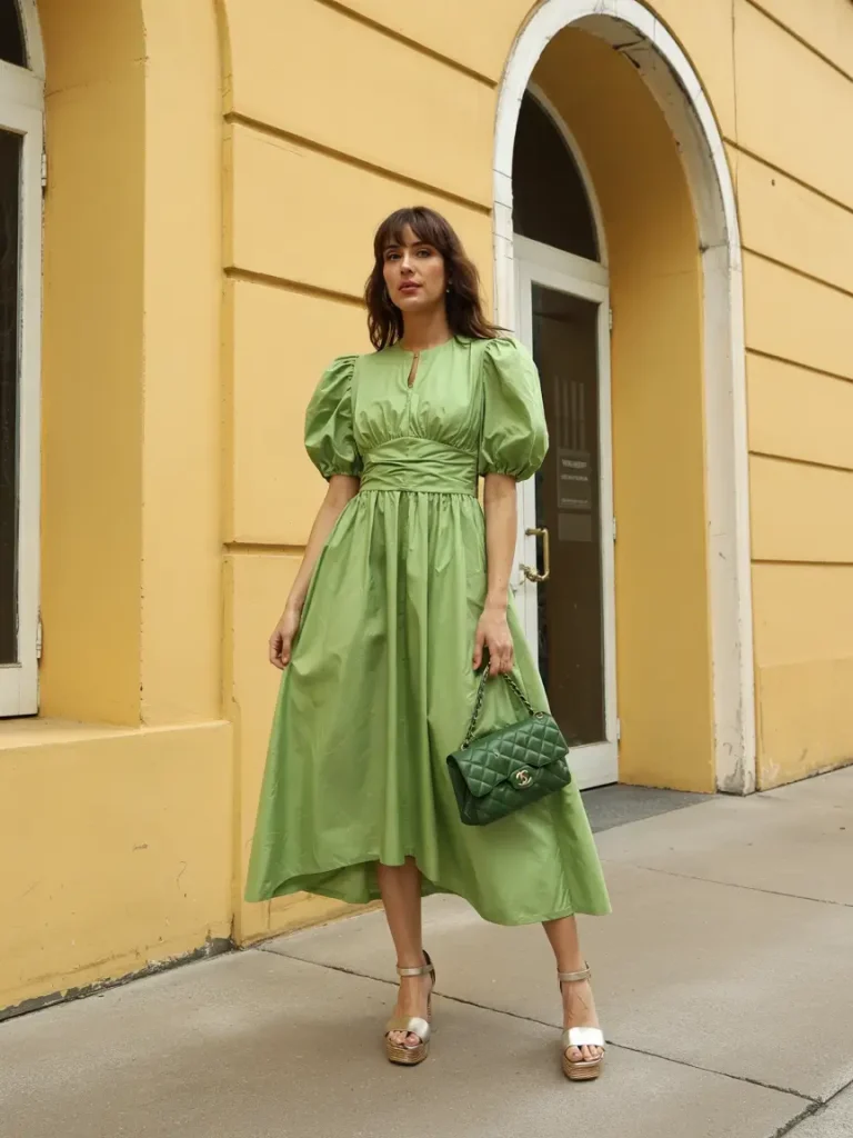 Puff-sleeved green dresses provide whimsical, airy silhouettes for garden or outdoor weddings. Structured waists and subtle sheen enhance photogenic appeal, making them an expressive spring wedding guest option.