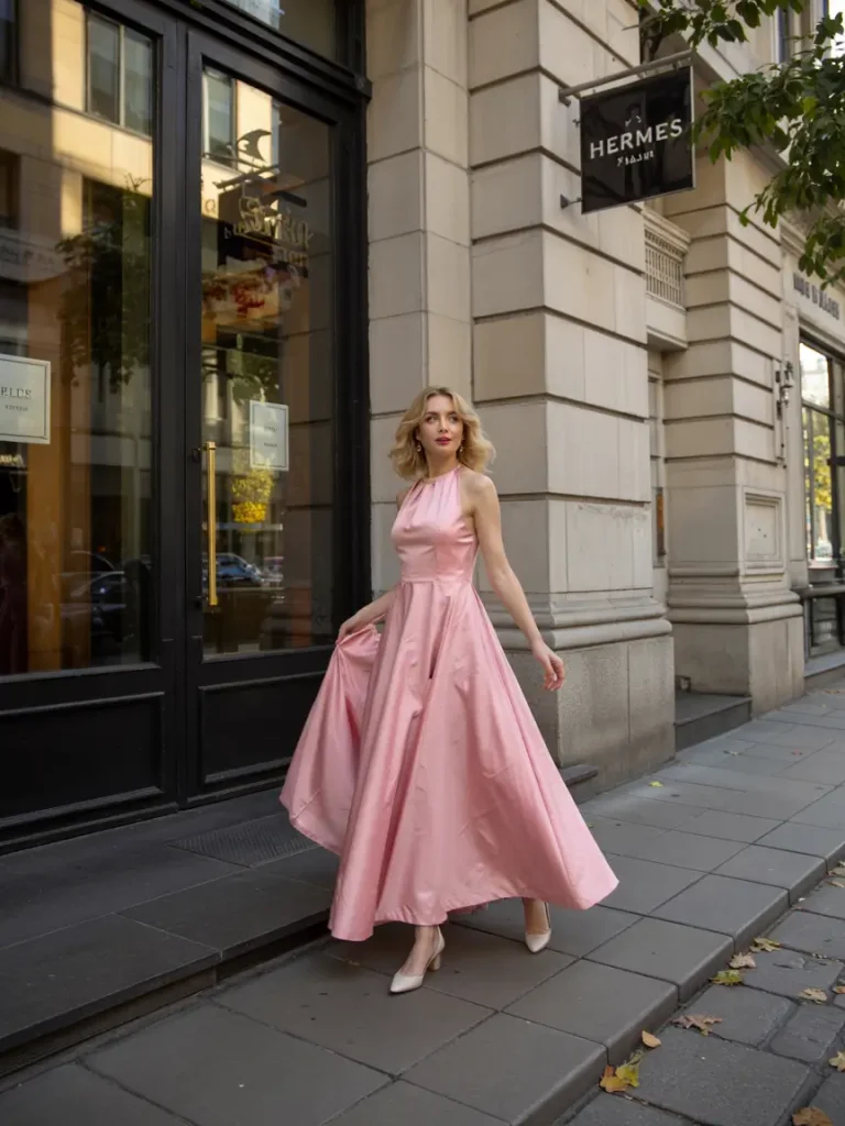 Blush satin halter dresses offer flowing, graceful silhouettes for elegant ceremonies. Full skirts and fitted bodices create balance, placing them within formal spring wedding guest attire without losing seasonal charm.