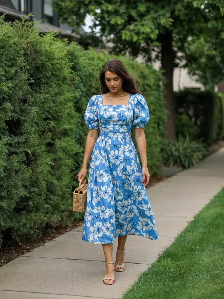 Bright blue floral dresses with structured necklines and puff sleeves offer movement and vibrant prints for casual yet polished outdoor ceremonies. Neutral accessories allow versatility, keeping the look cheerful, comfortable, and photogenic for spring wedding guest occasions.