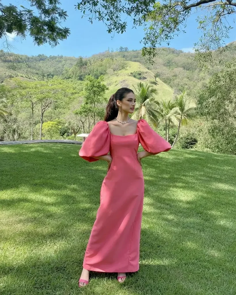Structured bodices paired with puffed sleeves create a bold yet romantic silhouette, especially in warm pink shades that contrast beautifully against spring greenery. These dresses suit outdoor ceremonies and lean toward formal spring wedding guest outfits without becoming evening gowns.