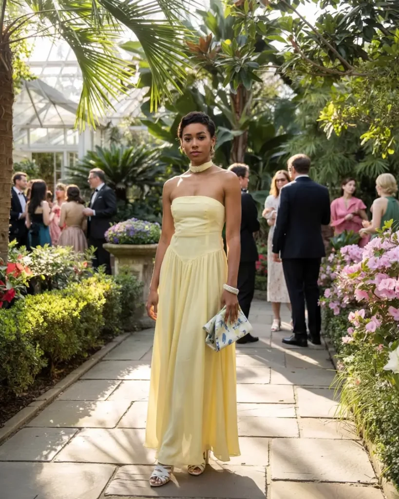 Strapless pale yellow dresses exude classic romance and are ideal for traditional spring weddings. The clean neckline allows for thoughtful accessories, while soft fabric movement enhances presence without overpowering. This style appeals to women across age groups and fits within the spring wedding guest category for timeless elegance.
