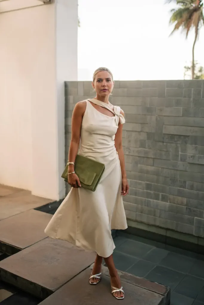 Neutral dresses with subtle structure offer sophistication while standing out against usual pastels and florals. Asymmetry, tied shoulder details, and gentle skirt flares create movement and minimalism, making them a classy spring wedding guest outfit option.
