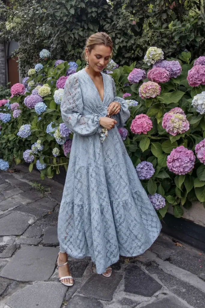 Soft lace dresses in muted pastel tones create romantic silhouettes for garden or greenery-filled venues. V-necklines and gentle volume balance the design, offering a whimsical yet refined spring wedding guest look.