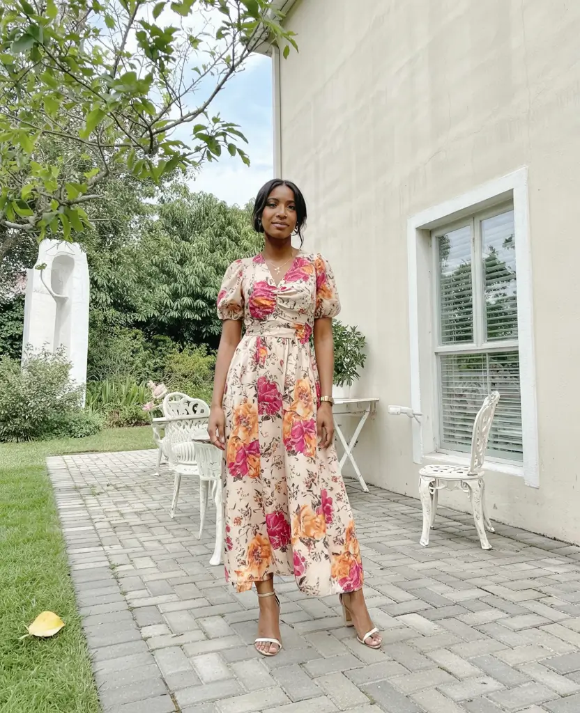 Floral prints in warm, retro-inspired tones combine modern tailoring with nostalgic charm. Puff sleeves, gathered bodices, and cinched waists make this dress perfect for cheerful outdoor celebrations. It’s a colorful spring wedding guest choice that communicates personality without overwhelming.
