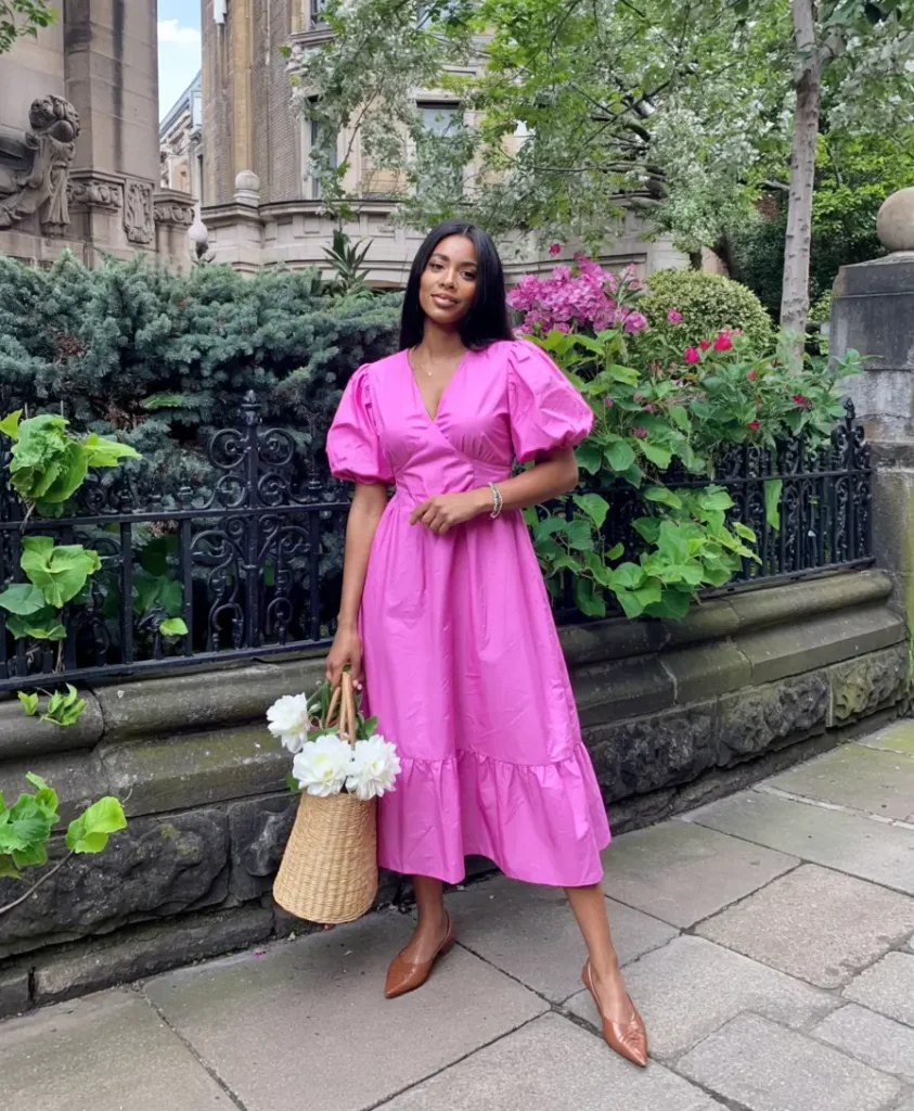 Pairing bold colors with neutral shoes balances the look while maintaining focus on the dress. Optimistic hues like pink continue to influence wedding guest fashion in 2026, conveying a cheerful and intentional style.