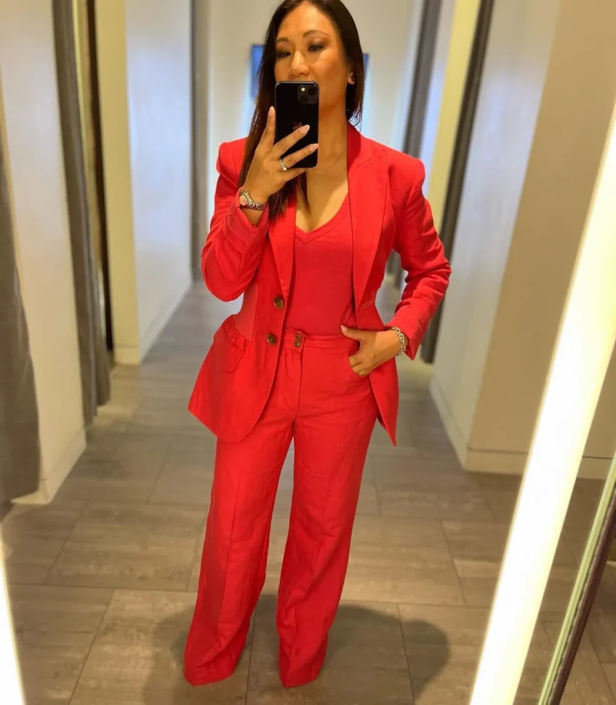Adding a belted blazer brings structure to linen trousers and defines the waistline. Pairing linen pants with a contrasting belted jacket adds dimension and works well with ankle boots or strappy heels depending on the season, creating a sleek, polished work outfit.