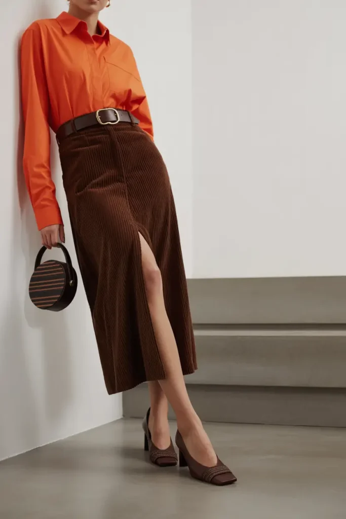 Bright shades can still work in Spring Work Outfits when styled correctly. An orange button-up with a corduroy skirt feels fresh and structured. The defined waist and clean silhouette help maintain a professional look while adding a playful spring touch.