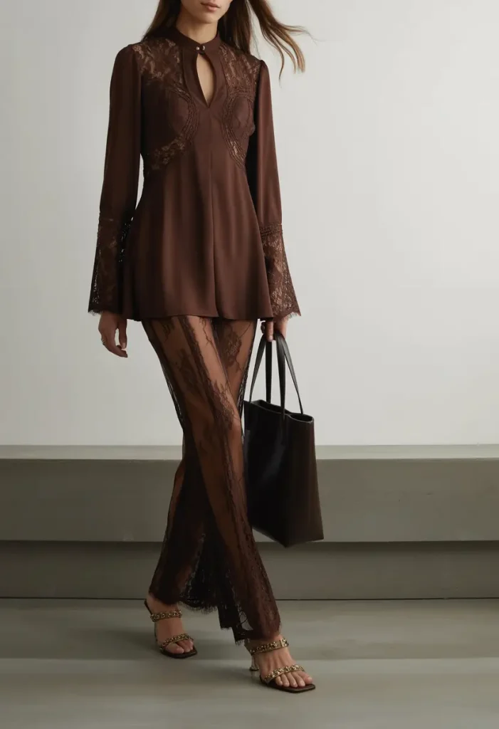 Textured fabrics can add interest to Spring Work Outfits when styled thoughtfully. Brown lace with long sleeves feels refined and creative, making it suitable for fashion-forward or creative offices. Paired correctly, it stays elegant and professional.