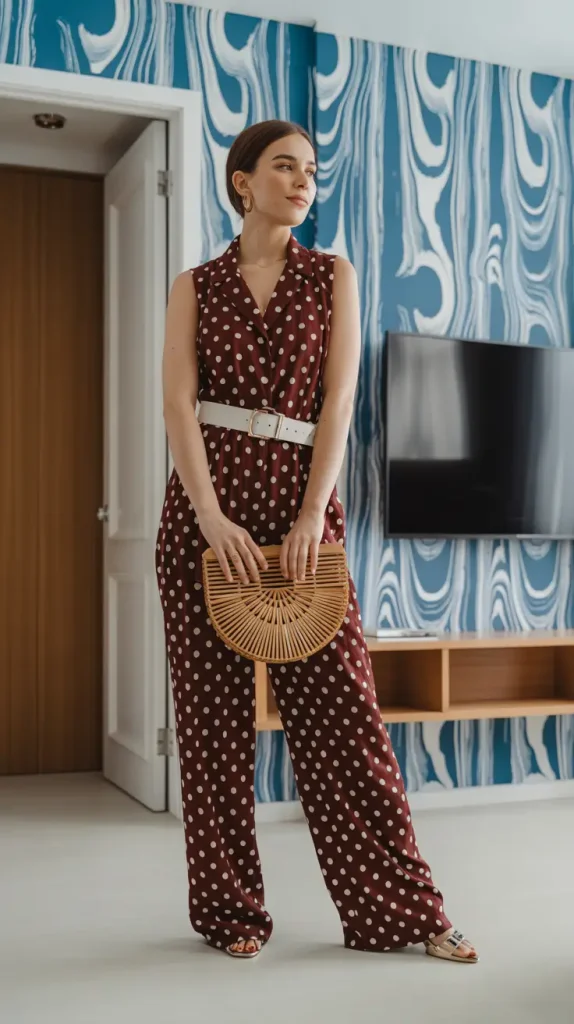 Prints can fit into Spring Work Outfits when kept subtle. A polka dot jumpsuit with a defined waist feels relaxed yet polished. It’s a comfortable option for casual offices while still maintaining a professional appearance.