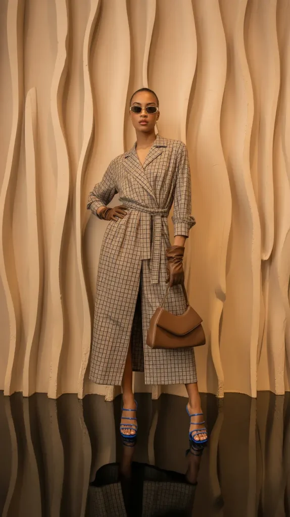 Layering light neutrals creates a refined look for Spring Work Outfits. A wrap-style coat dress paired with structured accessories feels elegant and practical. The balance of texture and clean lines keeps the outfit office-appropriate.