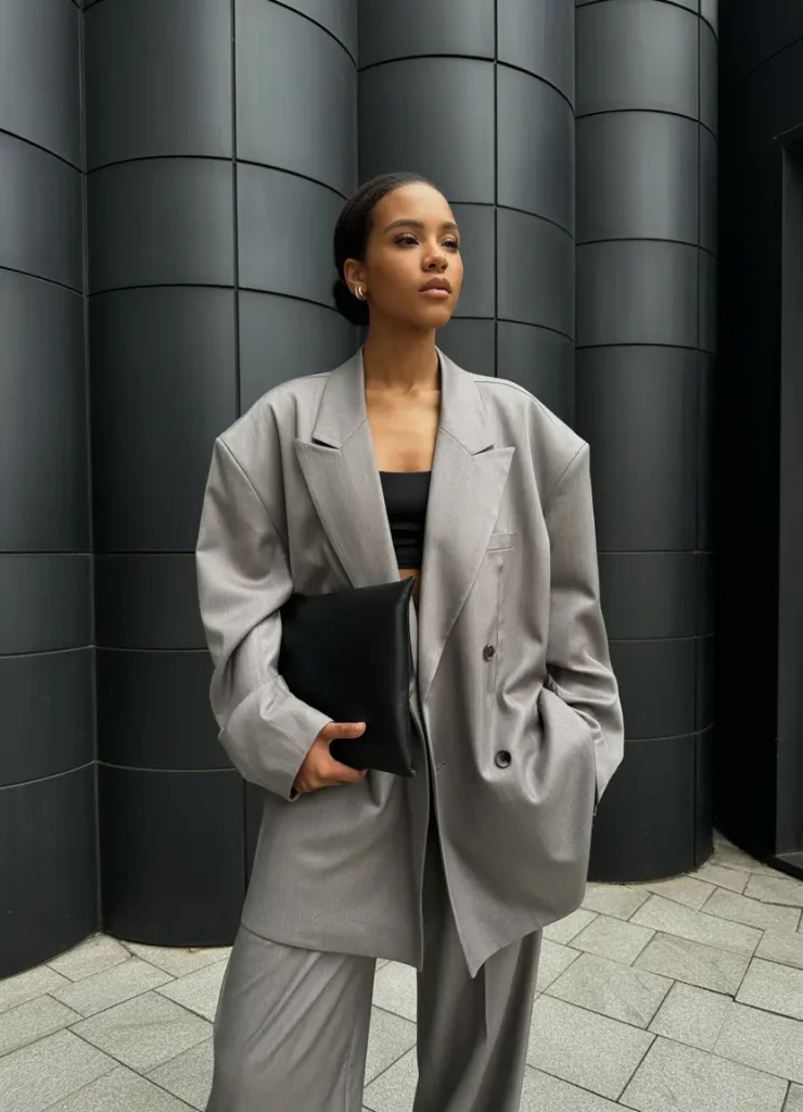 An oversized gray suit offers a clean, confident presence without feeling heavy. The relaxed blazer and fluid trousers give this outfit a modern business casual feel that works well for Spring Work Outfits in professional settings. It’s practical for busy schedules and easy to style for meetings, presentations, or everyday office wear.