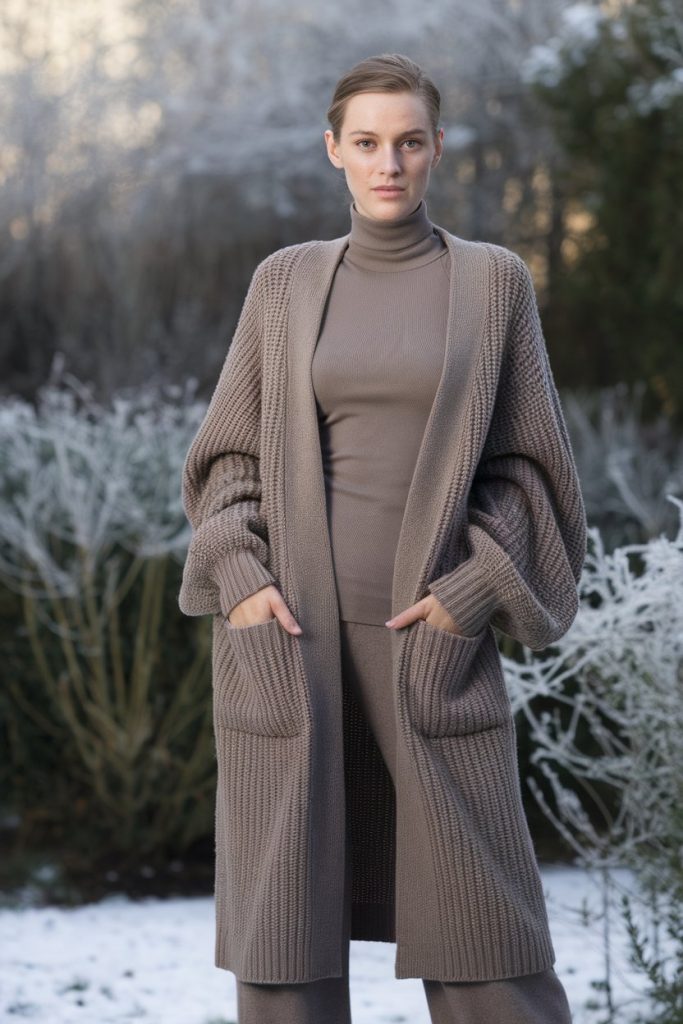 This winter look is built around soft taupe tones that come together to create a clean and harmonious outfit ideal for chilly weather. A long knit cardigan adds warmth while giving the outfit depth and visual interest. The fitted turtleneck paired with wide-leg trousers keeps the silhouette balanced, polished, and comfortable. The neutral color palette makes this outfit easy to adapt for different settings, making it a reliable choice for anyone aiming for a Classy Elegant Winter aesthetic.