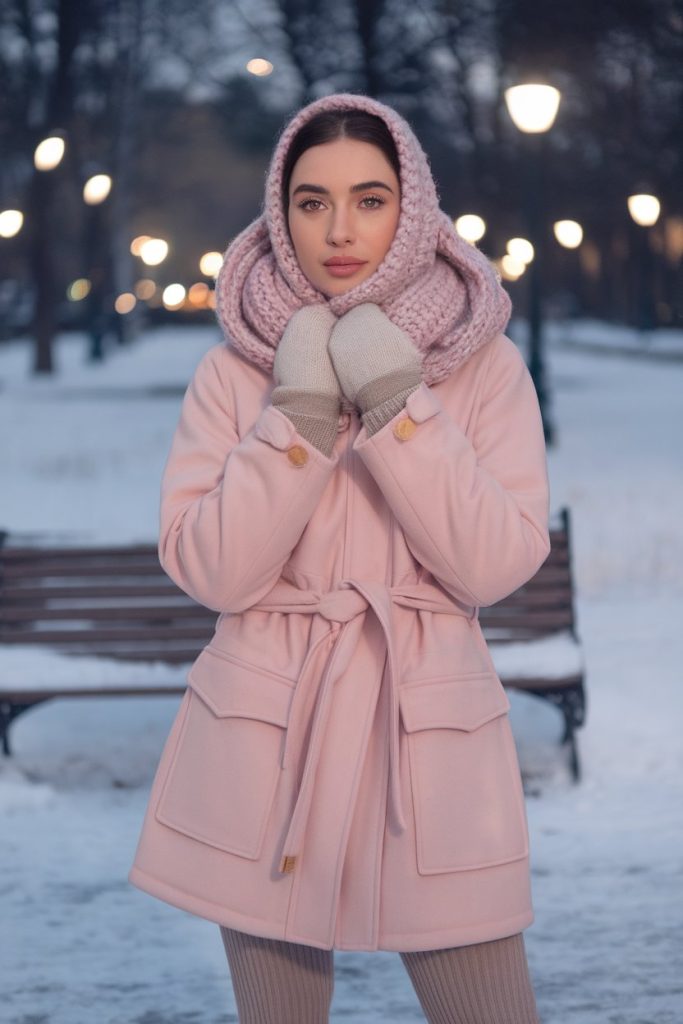 Soft pastel tones define this charming winter look, centered around a belted pink coat that feels both warm and elegant. The structured yet comfortable fit allows for easy movement while maintaining shape. A chunky knit scarf adds an extra layer of insulation and visual harmony, while wool mittens complete the cozy feel. This outfit is ideal for outdoor gatherings or winter walks with a gentle, refined touch.