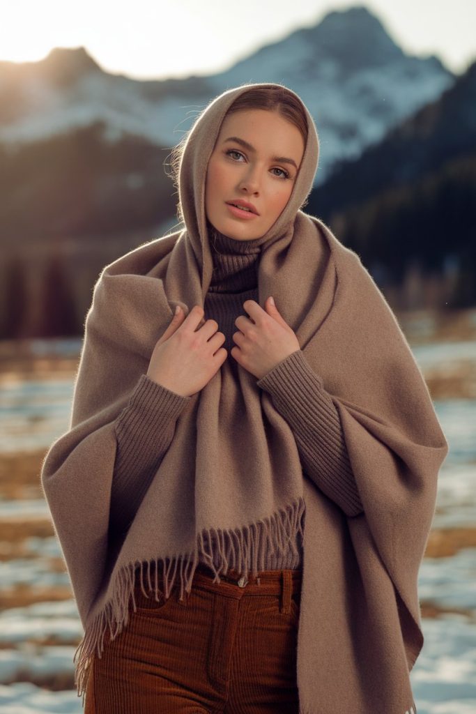 This winter outfit embraces calm, earthy shades and layered textures to create a comfortable and understated look. A wool shawl drapes gracefully, providing warmth while adding an elegant finish. The turtleneck underneath enhances insulation, and corduroy trousers bring texture and depth to the outfit. This look is well-suited for relaxed winter days that still call for a Classy Elegant Winter style.