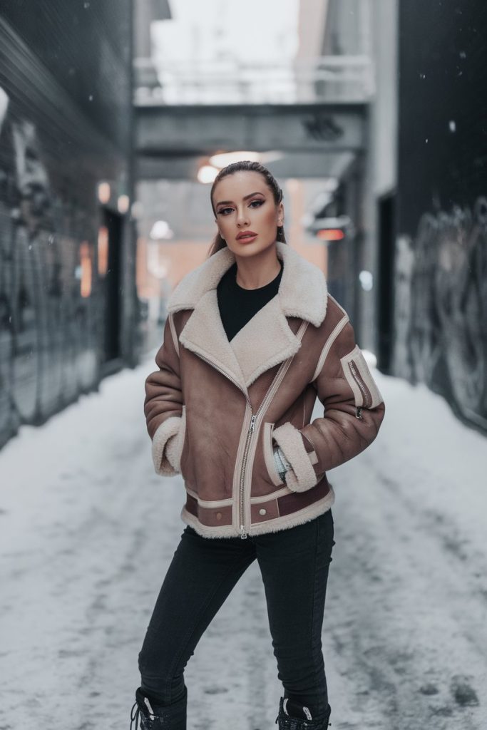 This winter look combines bold outerwear with simple basics to create a modern, city-ready style. The shearling aviator jacket offers structure, warmth, and visual impact with its thick lining. Black jeans and a minimal top keep the outfit grounded and balanced. This ensemble works well for everyday urban wear while delivering both function and style in colder weather.