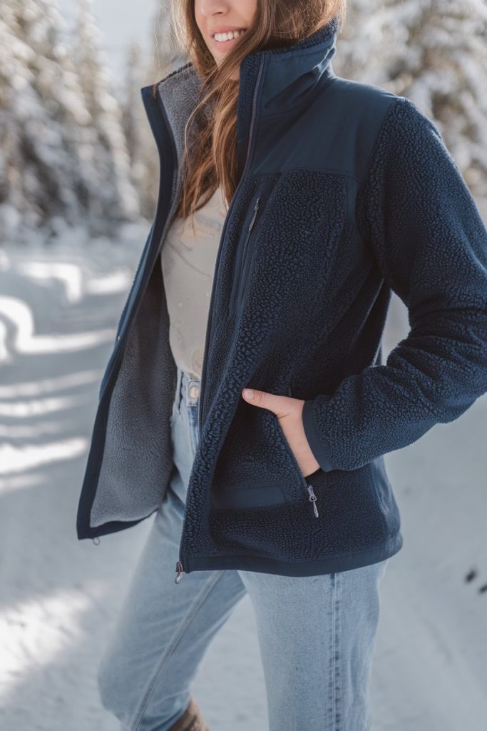 Designed for comfort and practicality, this winter outfit centers on a fleece jacket that provides warmth without feeling heavy. The soft material makes it ideal for layering over casual pieces during cold days. Light-wash jeans keep the look relaxed and approachable, making it suitable for outdoor activities or snowy walks. This outfit proves that winter dressing can be simple while still fitting into a Classy Elegant Winter lifestyle.