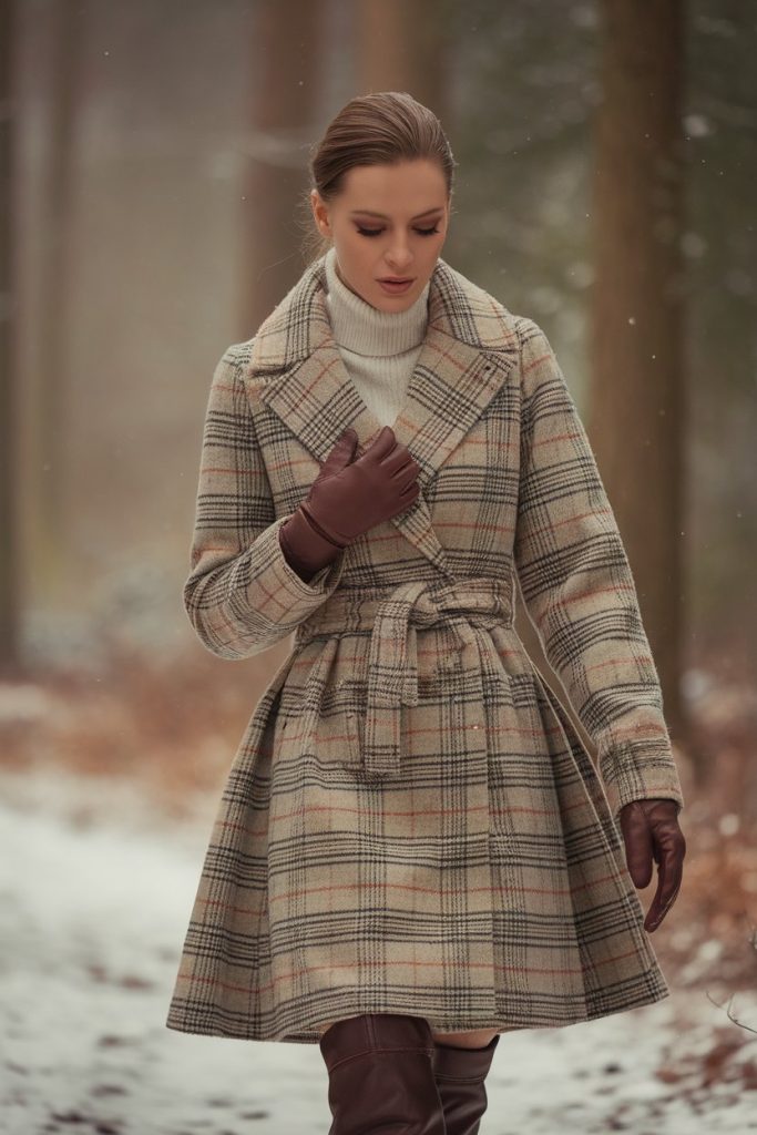 A classic plaid coat takes center stage in this refined winter outfit, offering both structure and insulation for cold outdoor days. The belted waist enhances the overall shape while keeping the look sharp and flattering. Soft, muted colors allow the coat to blend effortlessly into winter surroundings, while a warm turtleneck underneath provides extra comfort. Finished with leather gloves, this outfit delivers a timeless and elegant option for winter strolls and daily errands.