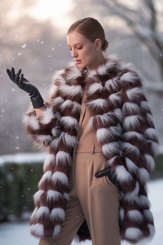 Bold and refined, this winter outfit makes a strong impression through its standout fur coat. The voluminous texture and rich color pattern provide warmth while creating a dramatic and luxurious appearance. A tailored neutral jumpsuit underneath keeps the silhouette clean and balanced, allowing the coat to shine. Finished with sleek leather gloves, this look is ideal for winter events where elegance and confidence are key.
