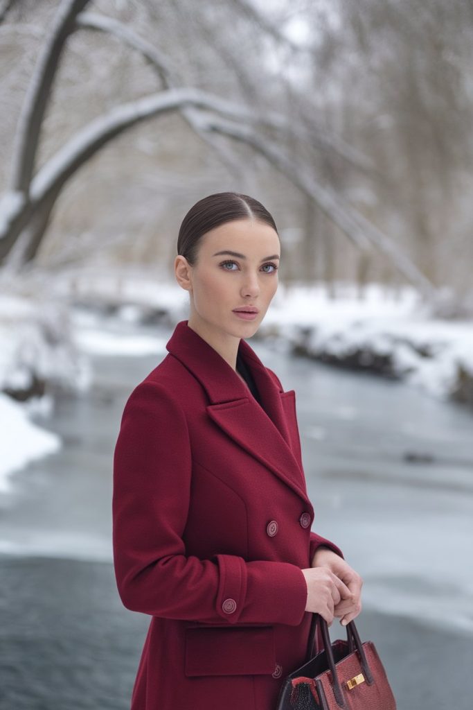 A deep red double-breasted coat defines this timeless winter outfit with its structured shape and tailored fit. The bold color stands out beautifully against neutral winter tones while maintaining a refined and elegant feel. Its polished design works well for both formal settings and everyday wear. This look is ideal for those who want to make a confident winter statement without sacrificing classic style.