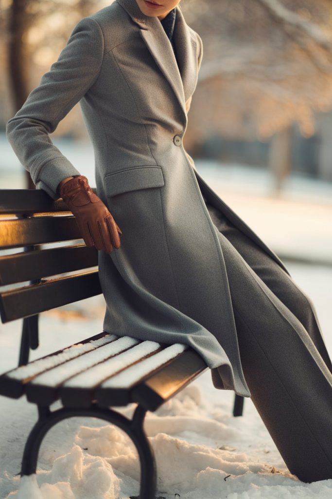 A long gray coat anchors this sophisticated winter outfit with its clean lines and structured design. The tailored fit offers a polished appearance that works seamlessly for workdays or casual outings. Wide-leg trousers complement the coat, adding balance and modern appeal. Leather gloves introduce subtle contrast while enhancing warmth, resulting in a refined and well-coordinated winter ensemble.