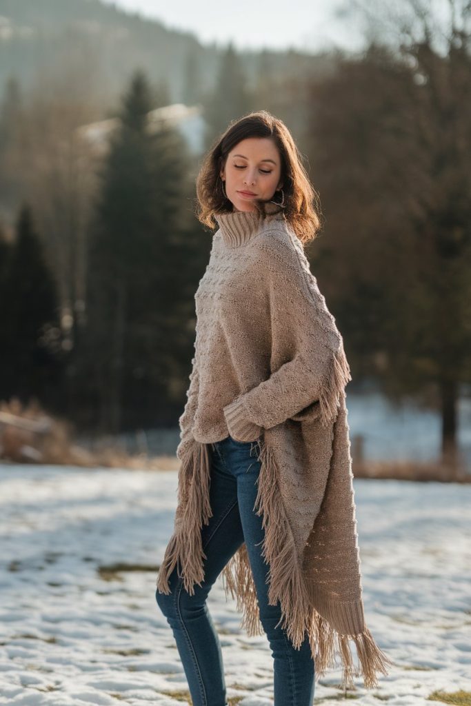 This outfit focuses on subtle elegance through soft neutral layers that feel effortless and refined. A flowing cape adds warmth and movement, making it ideal for cool weather. Paired with a fitted top and classic jeans, the look balances comfort with sophistication. Warm tones and gentle textures work together to create a polished yet approachable winter outfit.