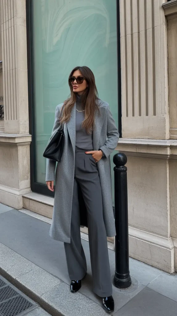 Layered outerwear takes center stage in this outfit. A long coat worn over tonal separates creates a streamlined, elegant look that’s ideal for city life.
