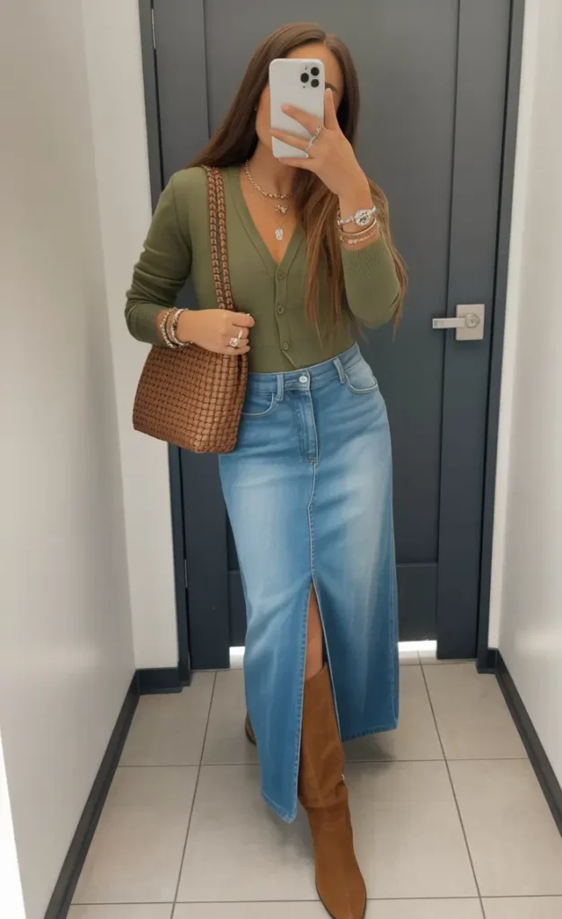 This look emphasizes softness and balance. A relaxed denim shirt paired with a ribbed midi skirt creates a gentle, elegant silhouette perfect for spring.