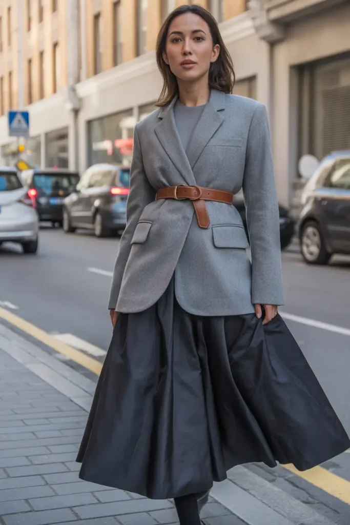 This outfit combines sharp tailoring with flowing elements for contrast. A belted blazer with a fluid skirt creates movement and elegance without feeling dramatic.