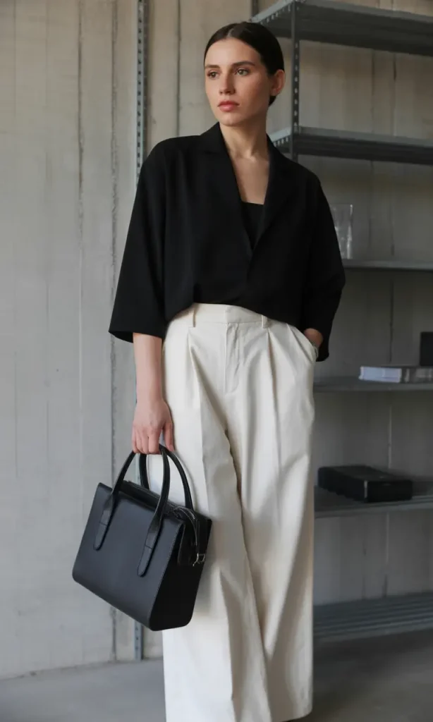 A simple black top paired with cream wide-leg trousers creates a clean, modern look that works almost anywhere.