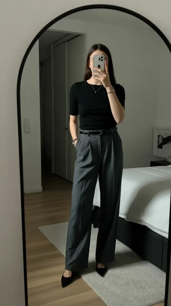 Clean lines define this outfit. A fitted top with tailored trousers creates a modern, wearable silhouette that suits busy days.