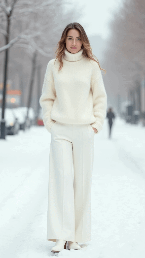 Winter outfits don’t have to rely on dark shades to look elegant. An all-white outfit creates a clean, refined look that feels fresh and modern during colder months. Combining soft knits with structured trousers helps create balance while maintaining warmth.
