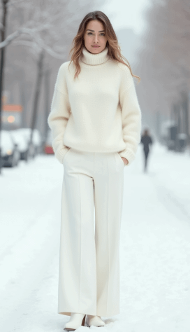 Step into winter with confidence by styling a head-to-toe white outfit. Pair a chunky turtleneck with tailored trousers for a sleek, polished look. Add white ankle boots and a structured bag to complete this striking, minimalist ensemble that radiates class and confidence.