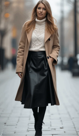 Mix edgy and feminine by pairing a leather midi skirt with a delicate lace top. Add black tights and ankle boots for warmth and balance. This combination creates a look that’s both bold and graceful — ideal for dinner dates or evening gatherings.