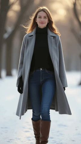 End the season on a high note with an all-white winter outfit. Layer a cream coat over a white sweater and tailored pants. Add heeled boots for a clean, confident finish that embodies pure elegance.