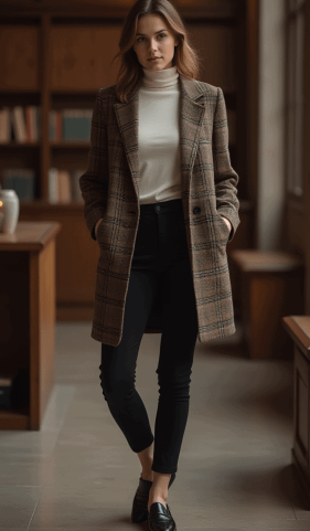 Plaid never goes out of style. Try a plaid blazer with black trousers and a crisp white turtleneck for an effortlessly elegant look. Add loafers or ankle boots to complete this timeless outfit that’s perfect for work or casual outings.