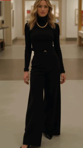A fitted turtleneck tucked into wide-leg trousers creates a sleek, professional look. Add pointed heels and minimal jewelry for a touch of elegance. This versatile outfit works beautifully for both office and casual winter days.