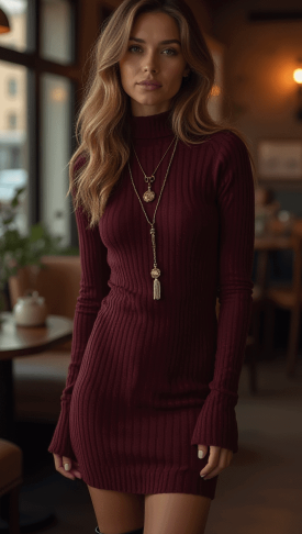A ribbed knit dress in a rich jewel tone is an easy way to stay warm and chic. Style it with knee-high boots and simple accessories. This look is comfortable, flattering, and perfect for both day and night wear.