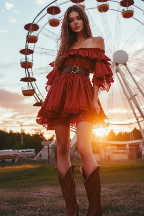 1. Deep Orange Ruffle Dress with Cowboy Boots