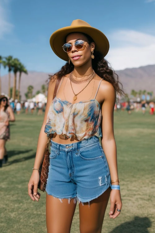 A pendant necklace and oversized sunglasses keep the look festival-ready. This outfit feels easy, playful, and perfect for warm weather.
