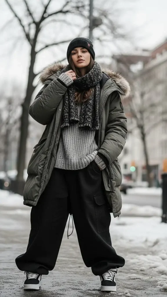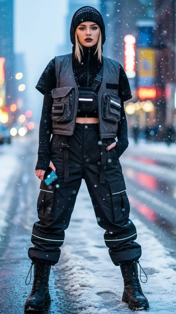 Tech-inspired cargo pants offer both style and practicality. Their relaxed fit and functional details contrast well with a fitted top, highlighting the waist. Combat boots and utilitarian accessories complete the look, making it ideal for icy streets and busy days. This outfit feels strong, modern, and ready for anything winter throws your way.