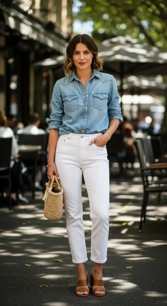 Chambray shirts and white jeans are a classic pairing for a reason. The light denim provides a gentle contrast to crisp white bottoms, creating a fresh, summer-ready feel. Tucking in the shirt slightly adds subtle shape to the outfit.