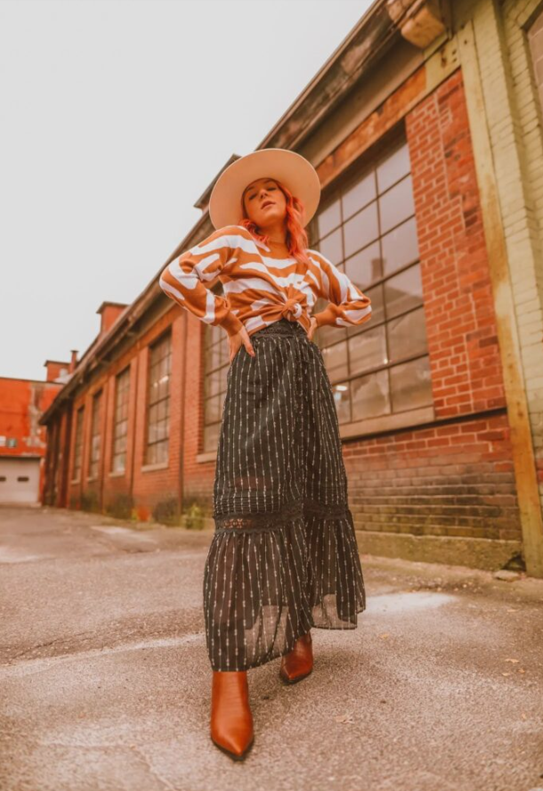 An orange-and-white striped sweater tied at the waist gives a relaxed feel. A dark maxi skirt adds flow and texture, while a wide-brimmed hat brings boho charm. Brown ankle boots finish the look with fall-ready warmth.