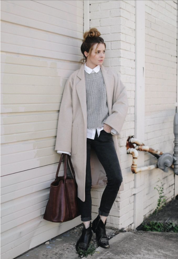 A collared white shirt under a chunky gray sweater sets a neat base. A beige oversized coat adds warmth, skinny jeans keep it sleek, and ankle boots with a brown tote make the outfit polished but easy.